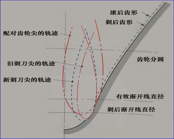 問題二:剃齒時,新剃齒刀和復磨后剃齒刀的刀尖在齒輪根部的運動軌跡。有效漸開線起始圓直徑和剃后漸開線起始圓直徑的關系